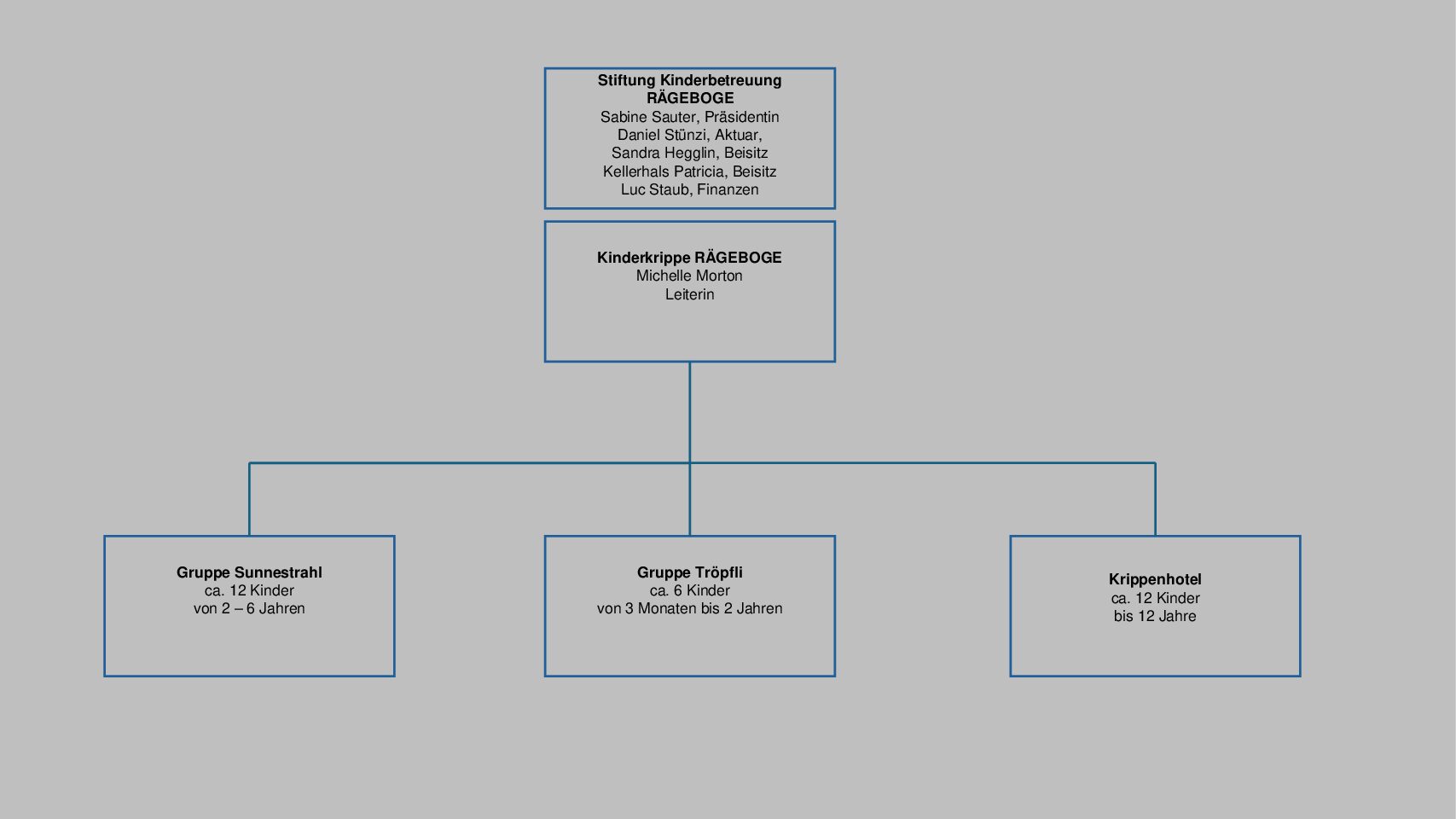 Die Krippe ist eine Institution der gemeinnützigen Stiftung „Kinderbetreuung RÄGEBOGE“, welche die Förderung der fachgerechten, Familien ergänzenden Betreuung von Kindern bezweckt.